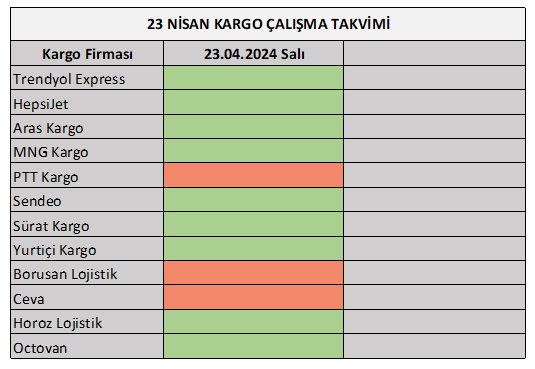 23 Nisan 2025 Çarşamba günü; Kolay Gelsin, Mng Kargo, Sürat Kargo, Trendyol Express ve Yurtiçi Kargo tam zamanlı çalışacaktır.