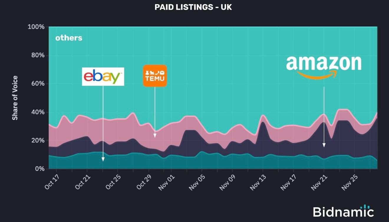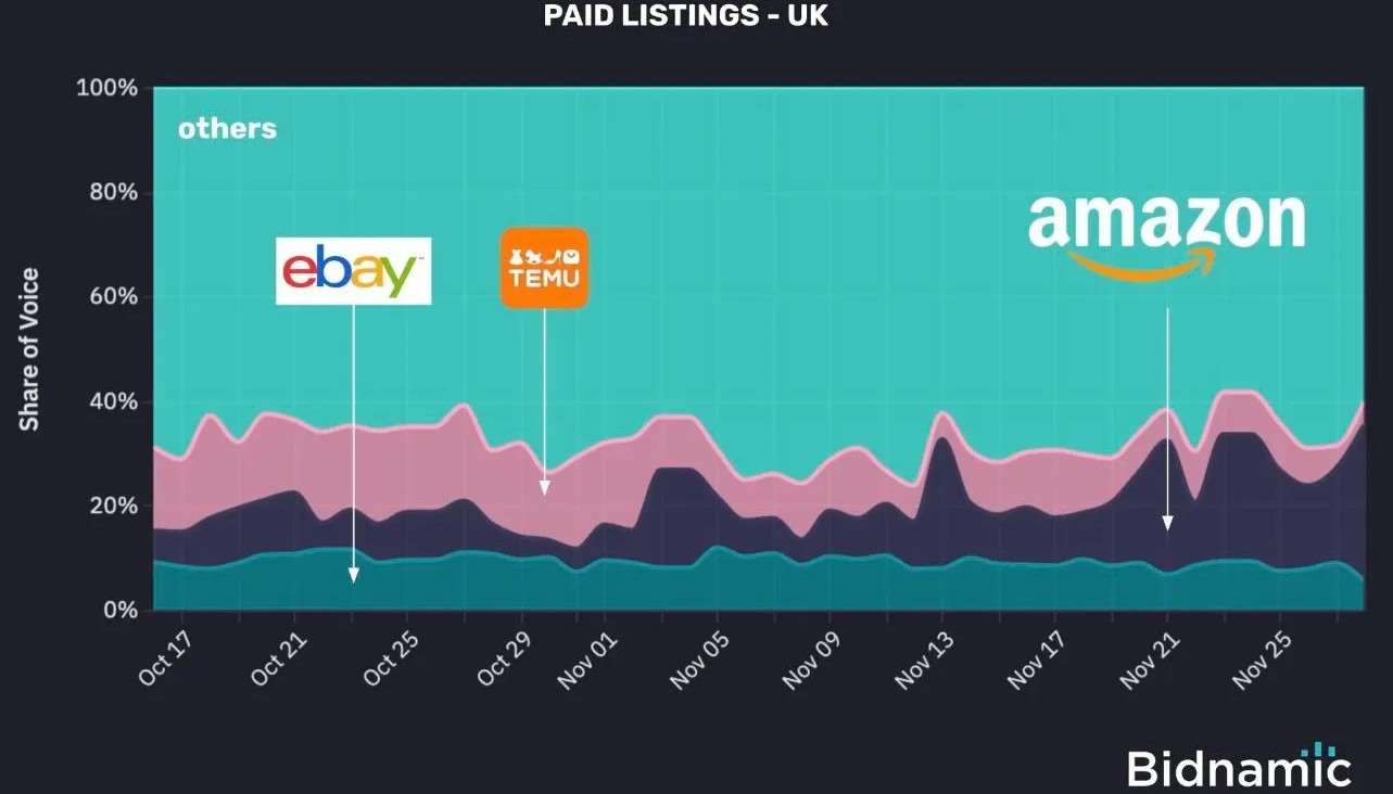 Google Shopping verilerine göre Amazon, İngiltere’deki Black Friday savaşında agresif bir bütçe stratejisiyle görünürlüğünü %30’a kadar yükselterek kontrolü tamamen ele almış. Buna karşılık Temu %4eBay ise %6 seviyelerine gerilemiş. Başlangıçta stabil giden bu platformların, rekabetin kızıştığı anlarda geri çekilmesi, “pazar payı yerine karlılığı” seçtikleri veya Amazon’un harcama gücüyle baş edemedikleri şeklinde yorumlanıyor.