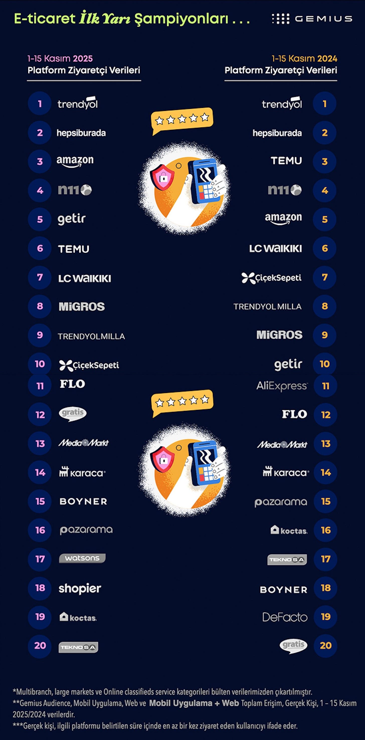 Gemius verilerine göre, Kasım ayının ilk yarısında Türkiye’deki e-ticaret platformları 52 milyon ziyaretçiyi ağırlamış. Kullanıcılar sitelerde ortalama 75 dakika geçirerek, indirim kovalayıp ürün araştırması yapmış. Yani mesainin bir kısmı yine sepete ürün eklemekle geçmiş. Reklam tarafında ise kelimenin tam anlamıyla kıyamet kopmuş: Gösterimler geçen yıla göre artarak 13 milyara ulaşmış. Zirve noktası, tahmin edeceğiniz üzere 1.3 milyar gösterimle 11.11 günü olmuş. Geçen yıl 3. sırada yer alan Temu, tüm kısıtlamalara rağmen ilk 5 listesini zorlamış. Verilerin tamamına bakmak isterseniz.