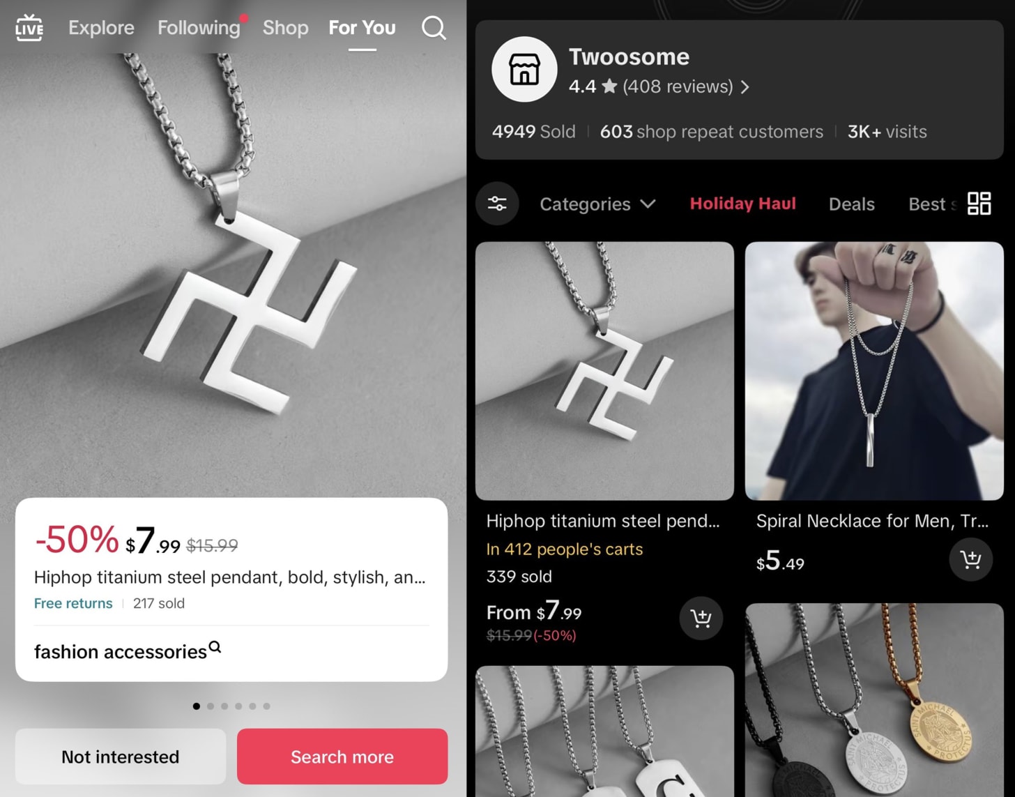 TikTok, Nazi sembollü kolye satan bir satıcıyla gündeme geldi. Tepkilere yol açan ürün 7,99 dolar fiyat etiketiyle ve “basit bir swastika (gamalı haç) sembolü, kız ve erkek çocuklar için uygun” açıklamasıyla platforma yüklenmiş. Satıcının bu tanımıyla birlikte kolyenin özellikle Hanuka (Yahudi Bayramı) sonrası dönemde kullanıcı akışlarında görünmesi ise tartışmayı büyütmüş. Tepkilerin ardından TikTok, ürünü fark edilir edilmez yayından kaldırdığını açıkladı. Şu an son durum nedir bilmiyorum ama platform satıcının mağazasını kapatmamış. Platformun içerik politikası gereği gamalı haç gibi semboller doğrudan politika ihlali sayılıyor.