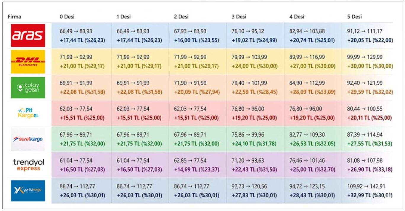 Trendyol, Anlaşmalı Desi Bazlı Kargo Fiyatları ve Kargo Barem Destek Uygulaması kapsamında 2026 yılına ait güncel kargo ücretlerini satıcılarla paylaştı. Yapılan bilgilendirmeye göre, 1 Ocak 2026 itibarıyla taşıma durumuna geçen siparişlerde yeni fiyatlar geçerli olacak. Yeni fiyat listesine göre 1-5 desi arasına %25-32 oranında zam yapılmış. Sürat Kargo, eski fiyat listesine göre %31,9 ile en yüksek, Aras Kargo ise %24,6 ile en düşük zam ortalamasına sahip. Barem destek uygulaması kapsamında 150-299 TL arası fiyat etiketine sahip ürünler en ucuz 65.83 TL, 0-149 TL arası 34.16 TL’ye TEX ya da PTT ile gönderilebilecek.